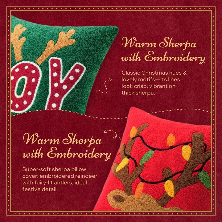 - 【Cozy Sherpa & Soft Velvet】 Combining velvet and Sherpa for dual comfort, these pillows mix soft textures with delicate embroidered details and aesthetic looks for that perfect holiday glow.